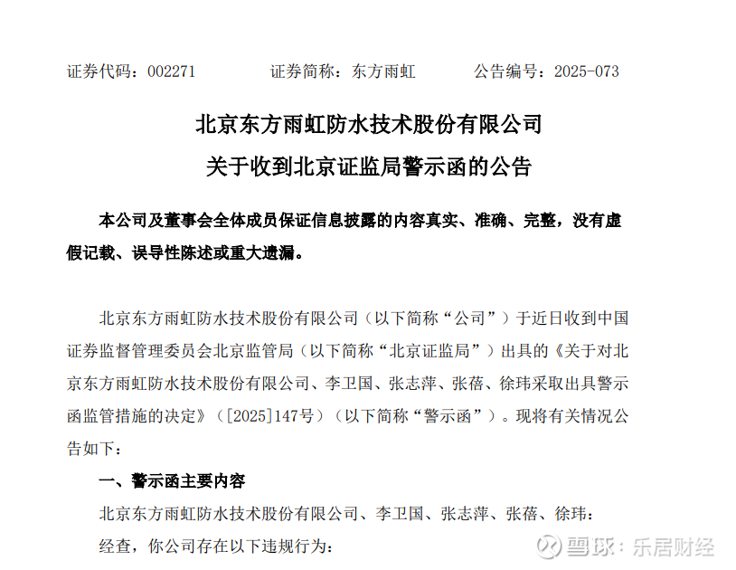 8月11日,东方雨虹(002271.SZ)发布关于公司及董事长李卫国等收北京证监局警示函的公告。经查,东方雨虹存在关联方非经营性资金占用且未及时披露、财务核算不规范公司财务核算不规范等违规行为,李卫国作为公司董事长、张志萍作为公司总经理、张蓓作为公司董事会秘书、徐玮作为公司财务总监,未能忠实、勤勉地履行职责。根据相关规定,对其采取出具警示函的行政监管措施,并记入资本市场诚信档案数据库。