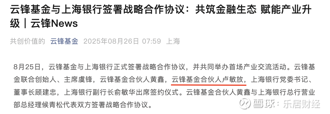 瑞财经 刘治颖据云锋基金公众号,8月25日,在云锋基金与上海银行签署战略合作协议时,卢敏放以云锋基金合伙人身份出席。
