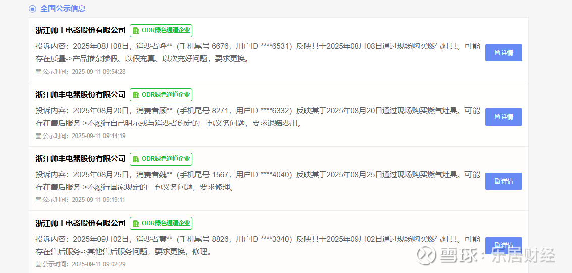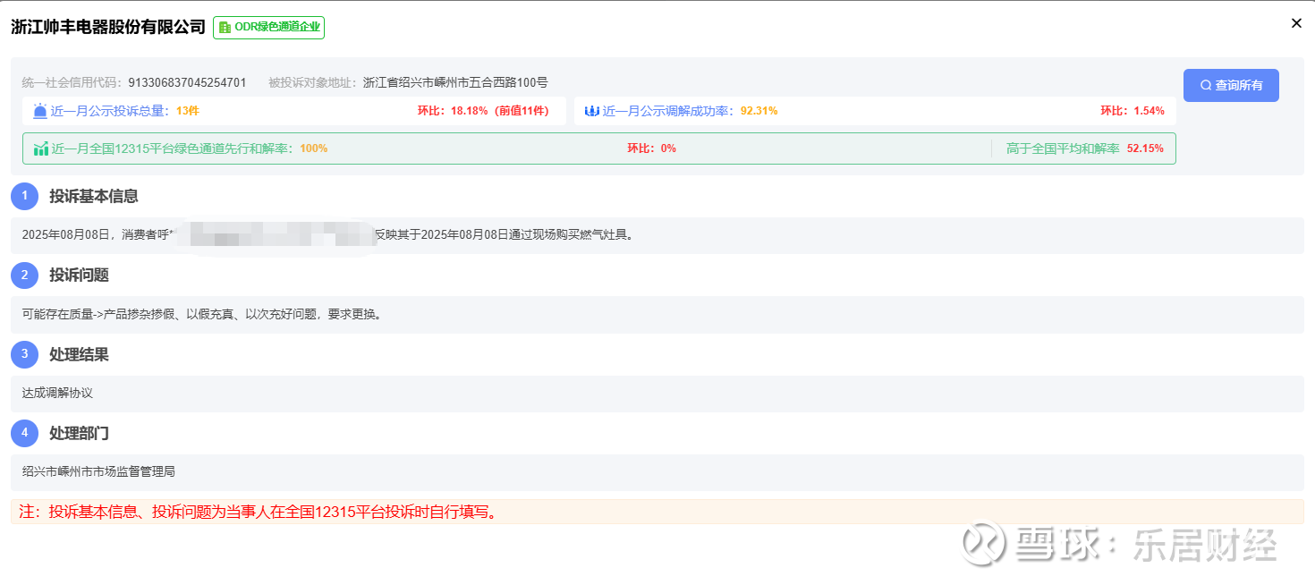 乐居财经 李兰 9月11日,据12315消费者投诉信息公示平台,浙江帅丰电器股份有限公司新增4件消费者投诉公示。