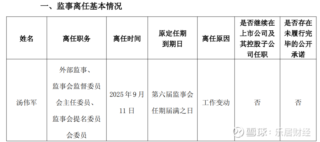 近日,公司监事会收到外部监事汤伟军辞呈。汤伟军因工作变动,向公司监事会提请辞去外部监事、监事会监督委员会主任委员、监事会提名委员会委员职务。汤伟军的辞任自2025年9月11日起生效。