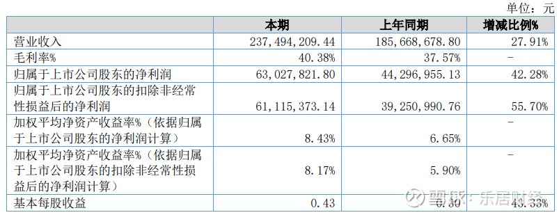 报告显示,民士达公司上半年营业收入为2.37亿元,同比增长27.91%;归母净利润为6302.78万元,同比增长42.28%;扣非归母净利润为6111.54万元,同比增长55.70%;基本每股收益0.43元。