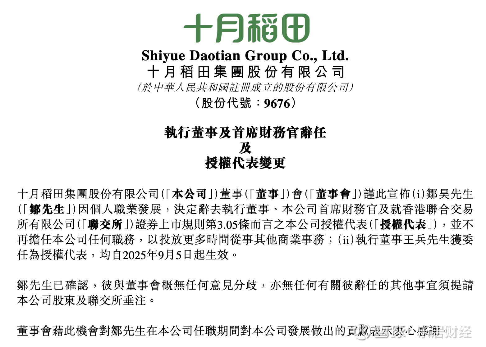 瑞财经 吴文婷 近日,十月稻田发布公告称,邹昊因个人职业发展,决定辞去执行董事、公司首席财务官及就香港联合交易所有限公司证券上市规则第3.05条而言之公司授权代表,并不再担任公司任何职务,以投放更多时间从事其他商业事务;执行董事王兵获委任为授权代表,均自2025年9月5日起生效。