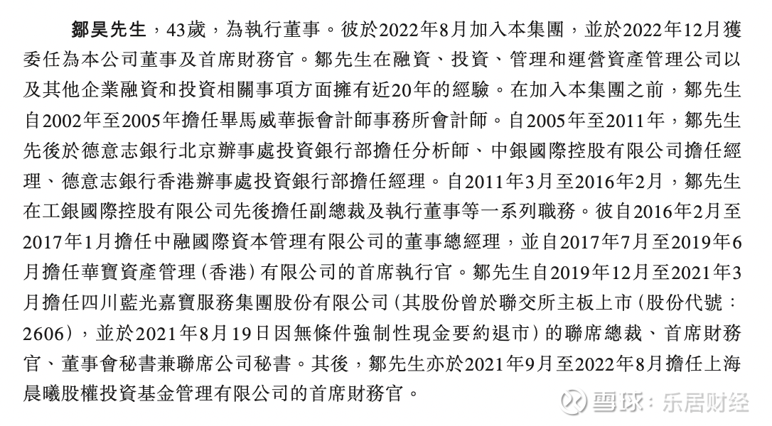 资料显示,邹昊,于2022年8月加入集团,并于2022年12月获委任为公司董事及首席财务官。邹昊在融资、投资、管理和运营资产管理公司以及其他企业融资和投资相关事项方面拥有近20年的经验。