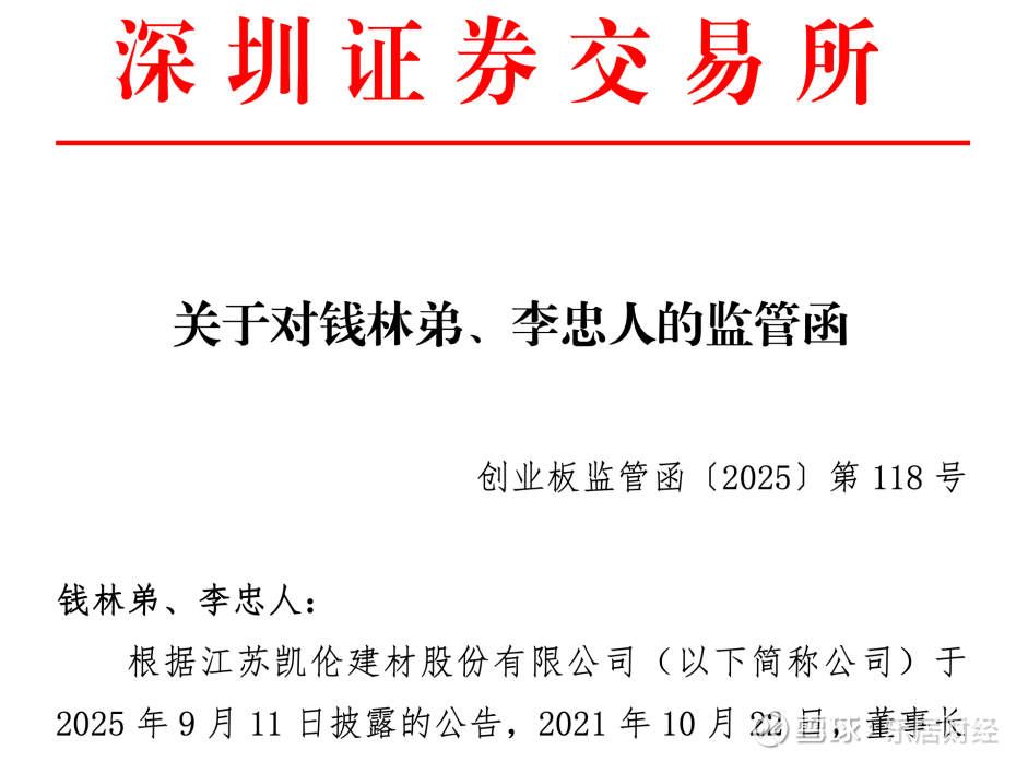 9月11日,凯伦股份(300715.SZ)董事长钱林弟、董事李忠人收到了监管函。