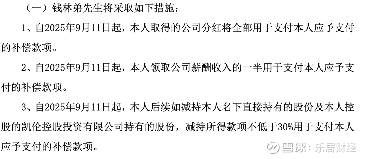 针对第三期款项再度逾期,凯伦股份在其公告中直言,原因是“承诺人钱林弟、李忠人、张勇因资金周转困难”,而钱林弟提出的解决方案则是:自2025年9月11日起,其个人取得的公司分红将、领取公司薪酬收入的一半以及名下直接持有的股份及本人控股的凯伦控股投资有限公司持有的股份,减持所得款项不低于30%,将用于支付其应予支付的补偿款项。