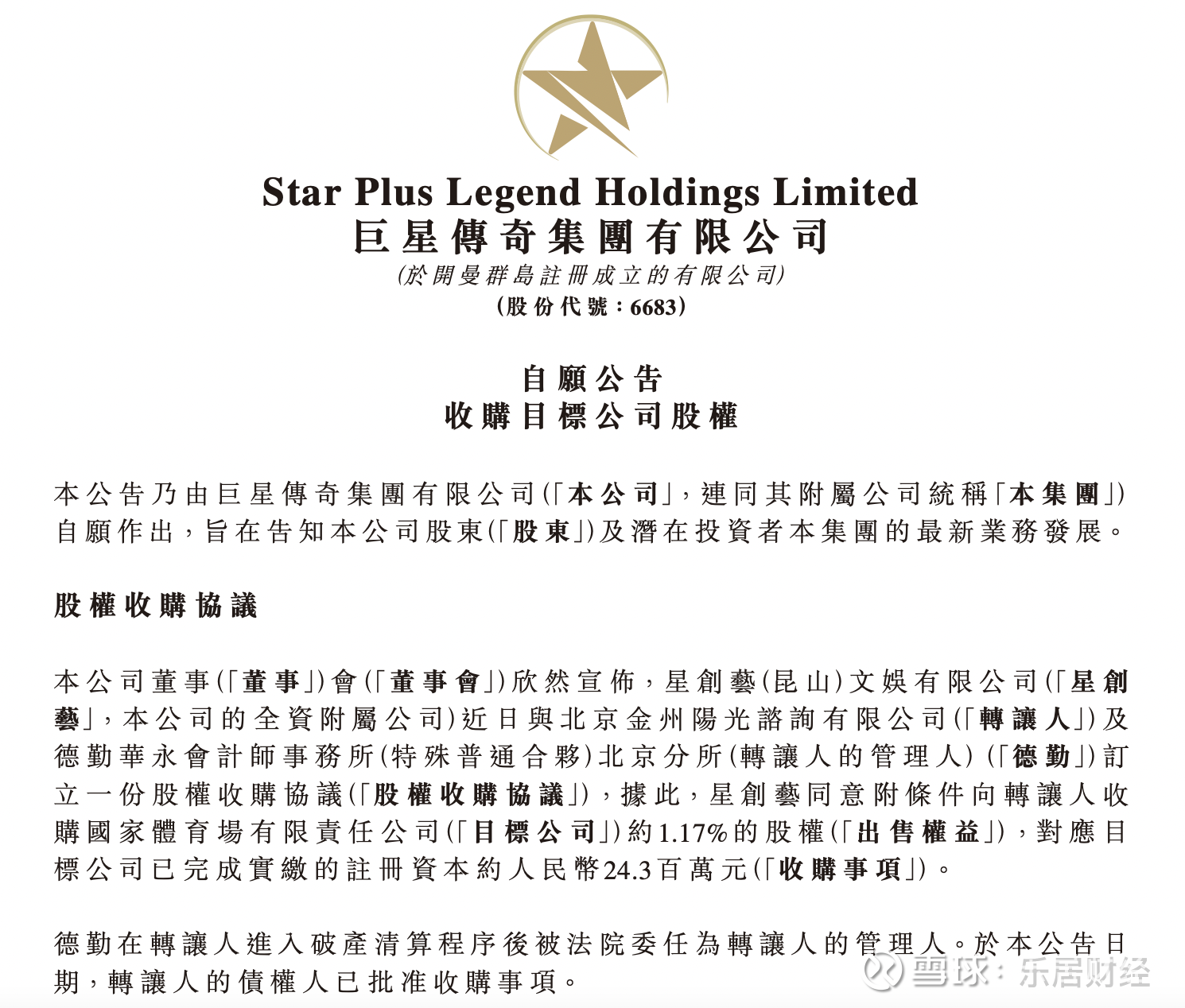 具体而言,星创艺(昆山)文娱有限公司(星创艺,公司的全资附属公司)近日与北京金州阳光谘询有限公司(转让人)及德勤华永会计师事务所(特殊普通合伙)北京分所(转让人的管理人)(德勤)订立一份股权收购协议。