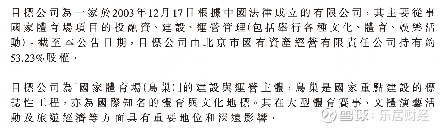 值得一提的是,目标公司为一家于2003年12月17日成立的有限公司,其主要从事国家体育场项目的投融资、建设、运营管理。 截至本公告日期,目标公司由北京市国有资产经营有限责任公司持有约53.23%股权。