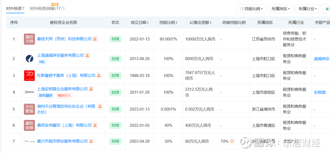 嘉信立恒设施管理(上海)有限公司成立于2020年6月,经营范围涵盖工程建设、物业管理等。其对外投资企业包括:上海道威保安服务有限公司、杜斯曼楼宇服务(上海)有限公司、嘉信天纳(苏州)科技有限公司等7家。