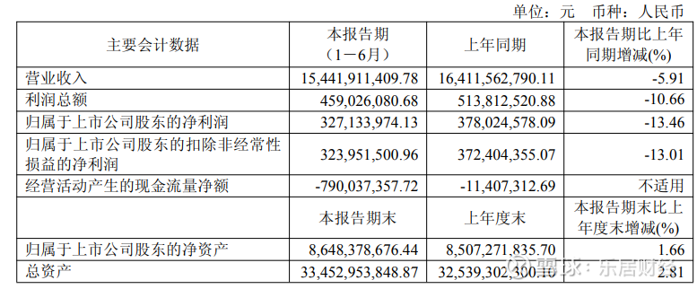 报告显示,太极实业公司上半年营业收入为154.42亿元,同比下降5.91%;归母净利润为3.27亿元,同比下降13.46%;扣非归母净利润为3.24亿元,同比下降13.01%;基本每股收益0.16元。