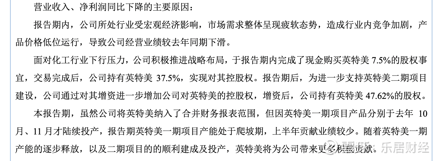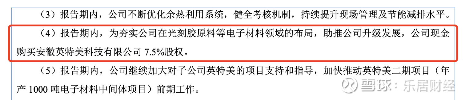 面对化工行业下行压力,佳先股份积极推进战略布局,于报告期内完成了现金购买英特美7.5%的股权事宜,交易完成后,公司持有英特美37.5%,实现对其控股权。目的是为了夯实公司在光刻胶原料等电子材料的布局,助推公司升级发展。