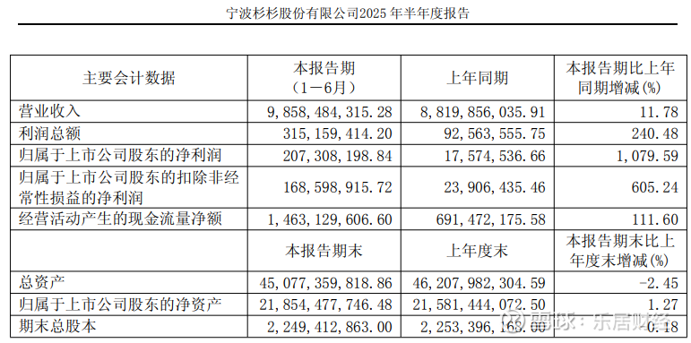 报告显示,杉杉股份公司上半年营业收入为98.58亿元,同比增长11.78%;归母净利润为2.07亿元,同比增长1079.59%;扣非归母净利润为1.69亿元,同比增长605.24%;基本每股收益0.10元。