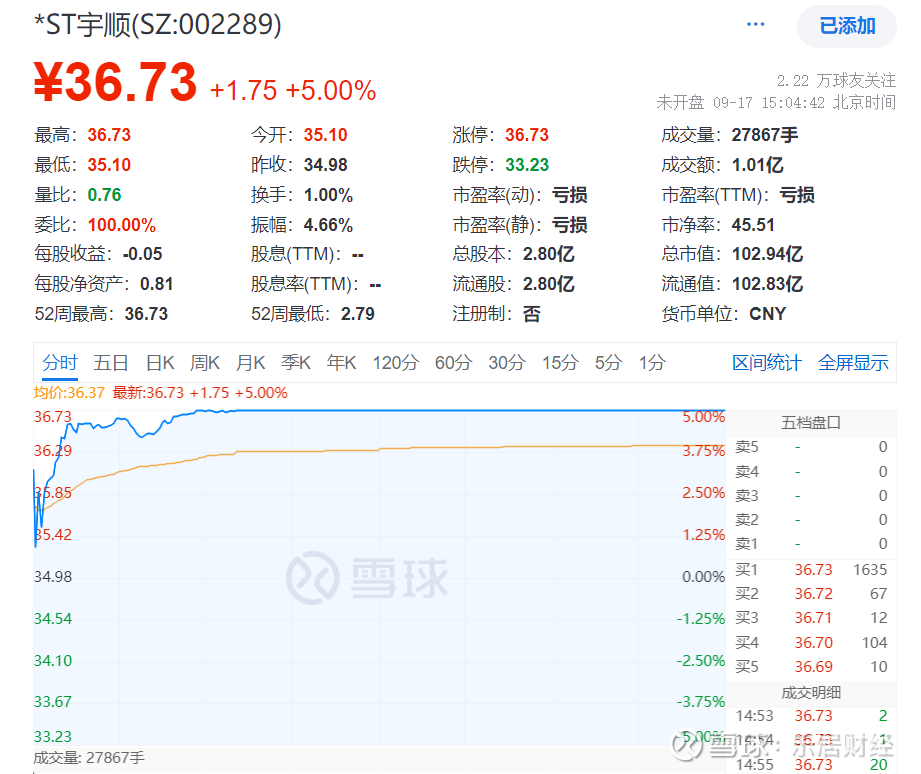 瑞财经 赵盼盼 9月17日,*ST宇顺(002289.SZ)再度涨停。截至当日收盘,公司股价为36.73元/股,总市值102.94亿元。
