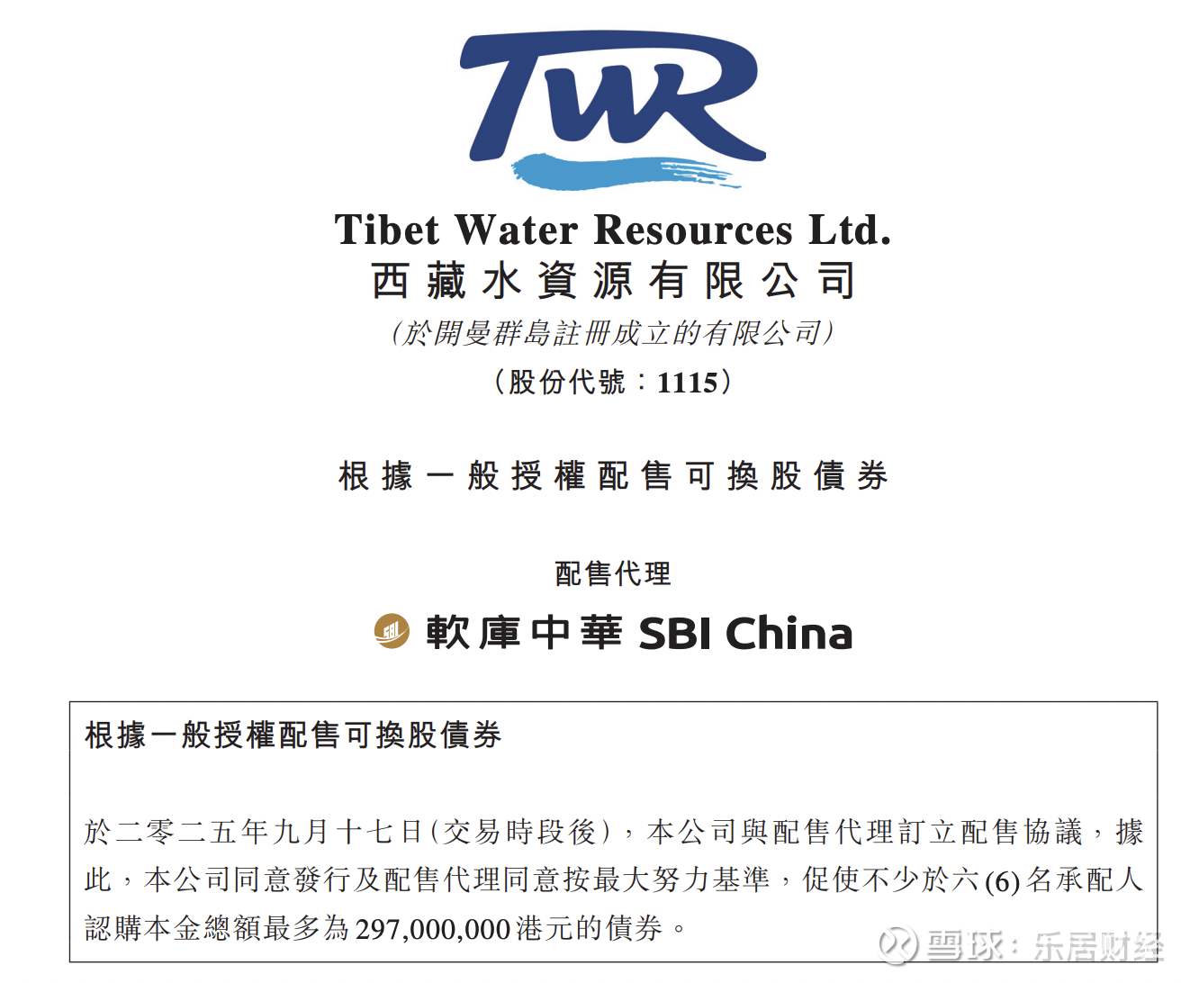 瑞财经 刘治颖9月17日,西藏水资源(01115)公告,于2025年9月17日,公司与配售代理订立配售协议,拟透过配售代理配售最多2.97亿港元的可换股债券。
