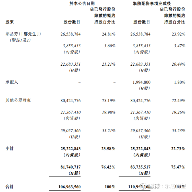 配售股份数目分别占于本公告日期之现有已发行H股总数及已发行股份总数约2.44%及1.86%;及分别占经根据配售事项发行之配售股份所扩大之已发行H股总数及已发行股份总数约2.38%及1.80%。