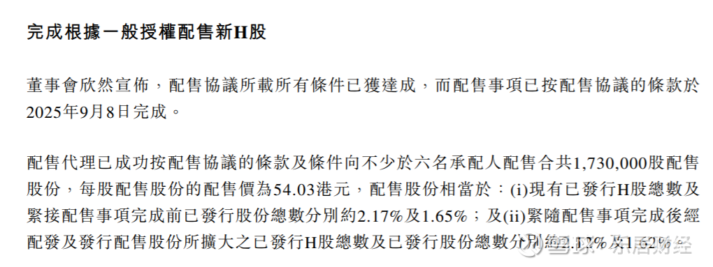 配售代理已成功按配售协议的条款及条件向不少于六名承配人配售合共173万股配售股份,每股配售股份的配售价为54.03港元,配售股份相当于:现有已发行H股总数及紧接配售事项完成前已发行股份总数分别约2.17%及1.65%;及紧随配售事项完成后经配发及发行配售股份所扩大之已发行H股总数及已发行股份总数分别约2.12%及1.62%。