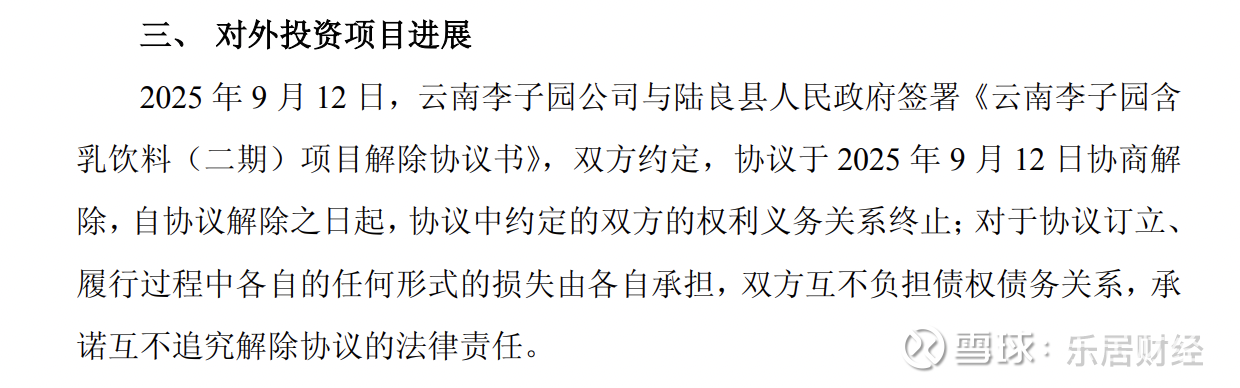 瑞财经 刘治颖近日,李子园(SH605337)公告,全资子公司云南李子园公司与陆良县人民政府于9月12日签署《云南李子园含乳饮料(二期)项目解除协议书》。双方同意解除原投资合作协议,互不追究解除协议的法律责任。