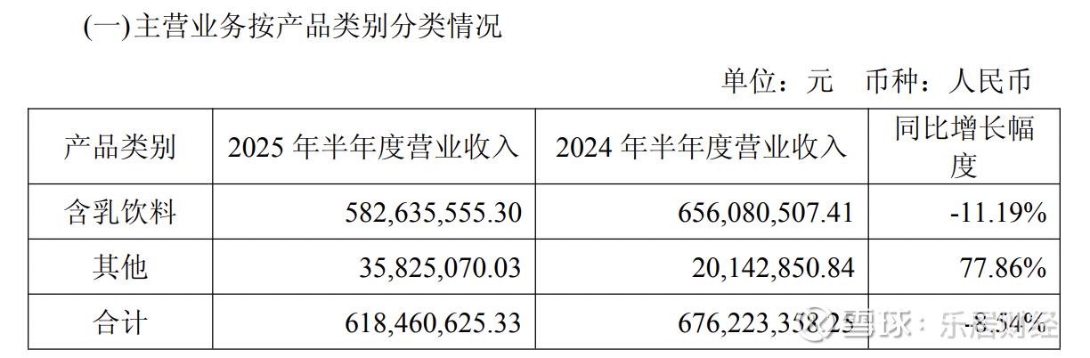 分产品来看,2025年上半年,李子园含乳饮料实现营收5.83亿元,同比下滑11.19%,该产品类别约占总营收94%;其他饮品实现营收0.36亿元,同比增长77.86%,该产品类别约占总营收6%。