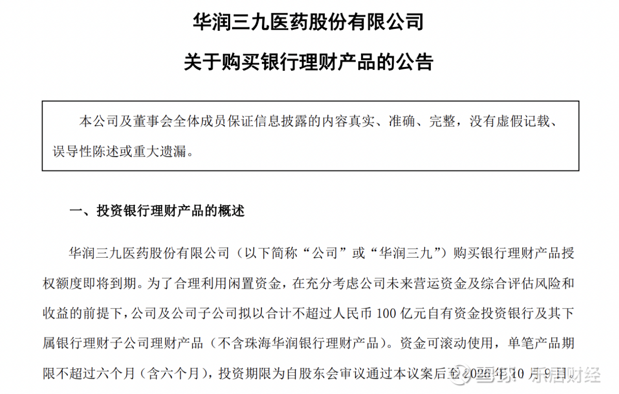 瑞财经 刘治颖9月17日,华润三九(SZ000999)公告,公司及公司子公司拟以合计不超过人民币 100 亿元自有资金投资银行及其下属银行理财子公司理财产品(不含珠海华润银行理财产品)。资金可滚动使用,单笔产品期限不超过六个月(含六个月),投资期限为自股东会审议通过本议案后至2026年10月9日。