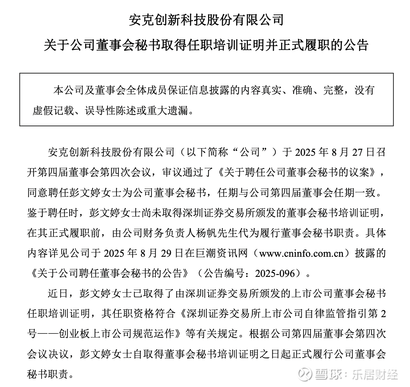 据了解,安克创新于2025年8月27日召开第四届董事会第四次会议,审议通过了《关于聘任公司董事会秘书的议案》,同意聘任彭文婷为公司董事会秘书,任期与公司第四届董事会任期一致。鉴于聘任时,彭文婷尚未取得深圳证券交易所颁发的董事会秘书培训证明,在其正式履职前,由公司财务负责人杨帆代为履行董事会秘书职责。