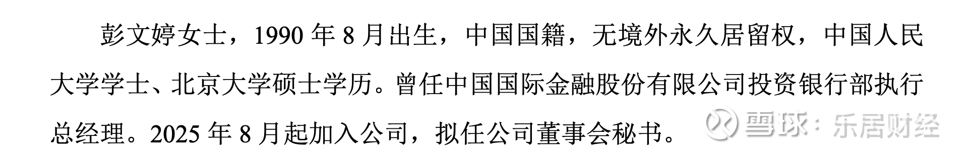 资料显示,彭文婷,1990年8月出生,中国国籍,无境外永久居留权,中国人民大学学士、北京大学硕士学历。其曾任中国国际金融股份有限公司投资银行部执行总经理。2025年8月起加入公司,拟任公司董事会秘书。