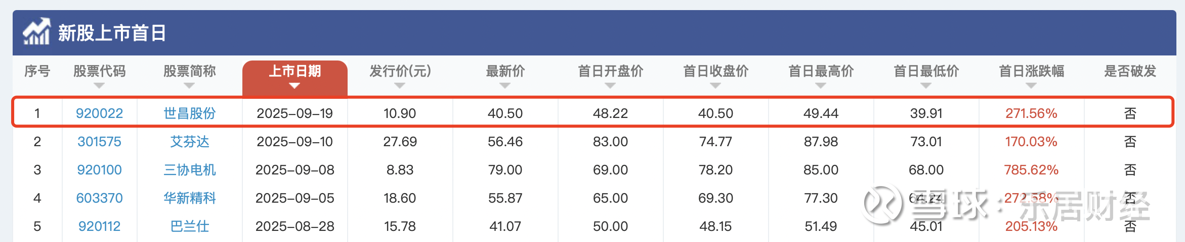 回顾上周(9月15日-9月19日),A股迎来了1只“新成员”。世昌股份登陆北交所,在首日表现中,其大涨271.56%。