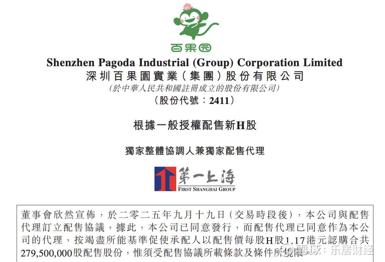 瑞财经 刘治颖9月21日,百果园集团(02411)公告,拟配售2.795亿股新H股,占扩大后H股总数约16.1%,及扩大后股份总数约15.4%;每股配售价1.17港元,较9月19日收市价1.45港元折让19.31%。