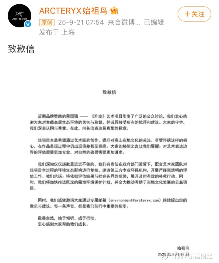 9月21日,就户外品牌始祖鸟联手艺术家蔡国强在喜马拉雅山举办名为《升龙》的放烟花活动一事,双方各自发出致歉信。