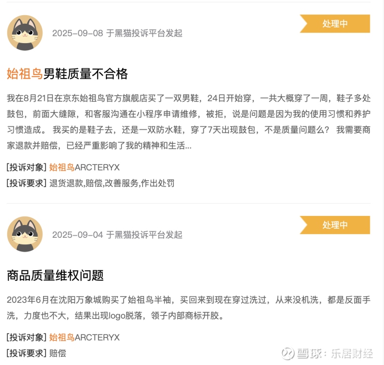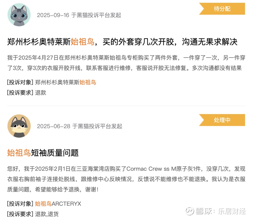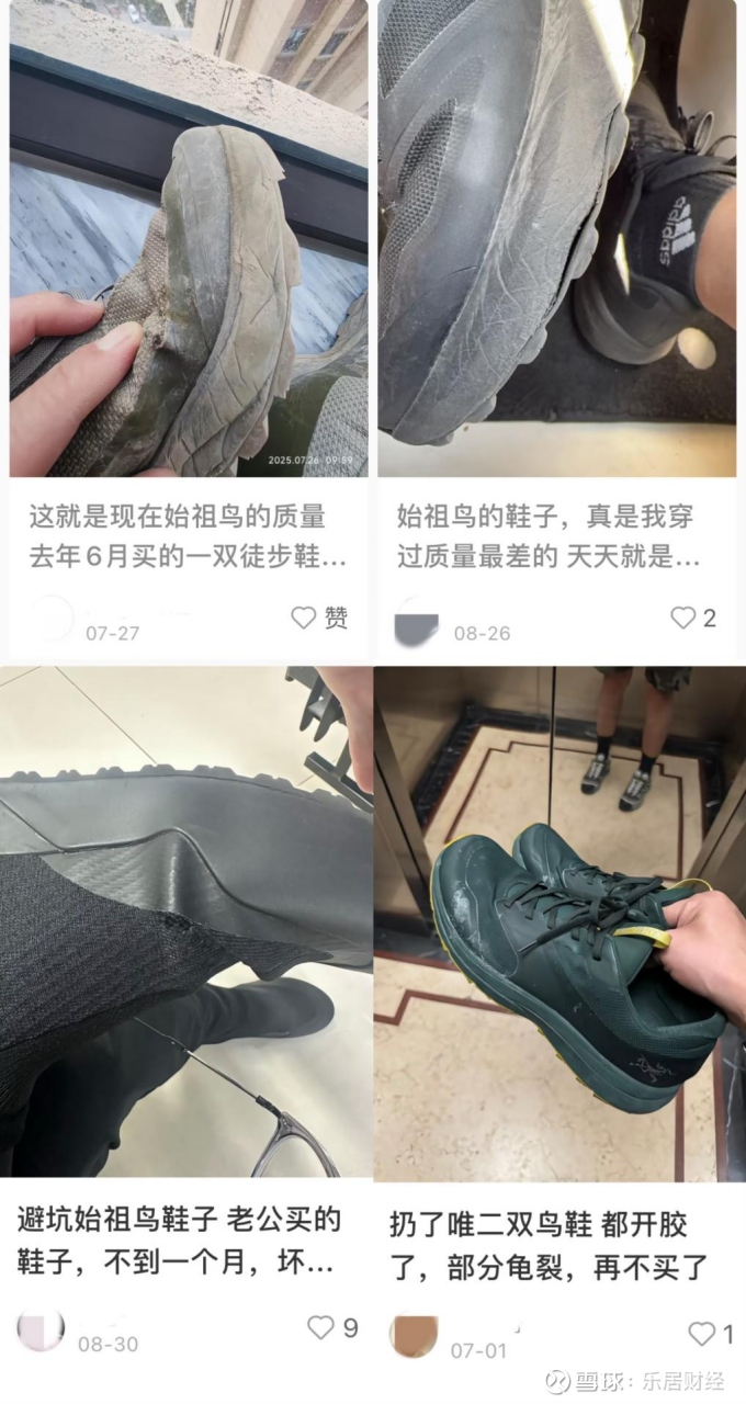 有不少消费者表示,花上千元买下始祖鸟产品后,鞋子边缘开胶、外套鼓包起球、衣服LOGO脱落等质量问题接踵而至,让 “高价不等于高质” 的争议持续发酵。更有消费者戏谑,“高端始祖鸟,质量却‘鸟’样”。