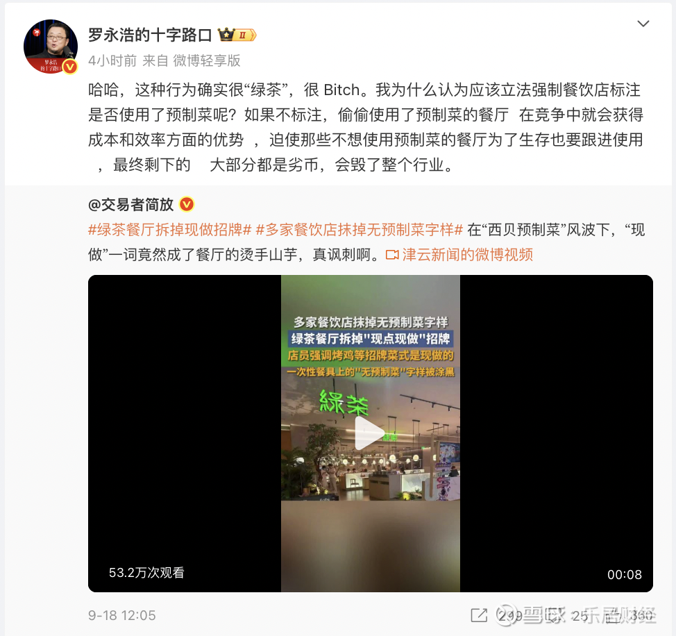 瑞财经 刘治颖9月22日,罗永浩转发“绿茶餐厅拆掉现做招牌”博文,并表示:“哈哈,这种行为确实很‘绿茶’,很Bitch。我为什么认为应该立法强制餐饮店标注是否使用了预制菜呢?如果不标注,偷偷使用了预制菜的餐厅,在竞争中就会获得成本和效率方面的优势,迫使那些不想使用预制菜的餐厅为了生存也要跟进使用,最终剩下的大部分都是劣币,会毁了整个行业。”