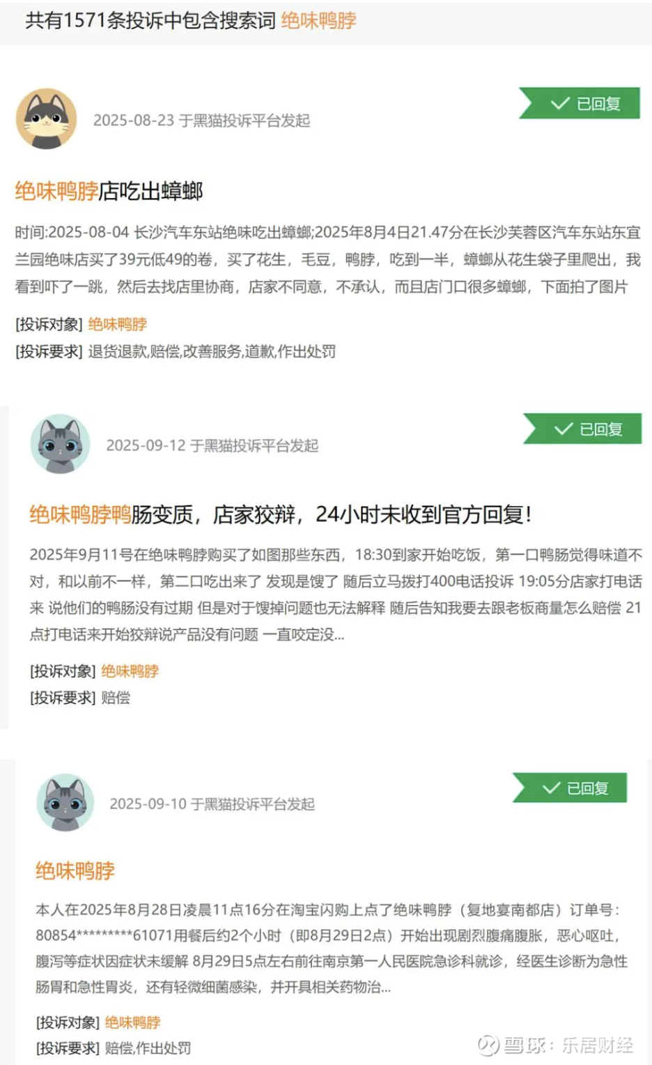 黑猫投诉上,目前共有1571条投诉关于绝味鸭脖。最新投诉内容包括产品变质、吃出蟑螂、用餐后恶心呕吐腹泻等。