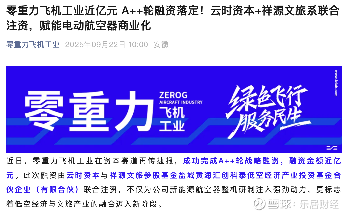 瑞财经 吴文婷 9月22日,零重力飞机工业宣布完成A++轮战略融资,融资金额近亿元。