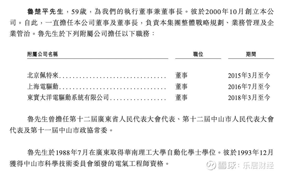资料显示,鲁楚平,59岁,为公司执行董事兼董事长。其于2000年10月创立公司。自此,一直担任公司董事及董事长,负责集团整体战略规划、业务管理及企业管治。