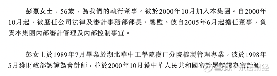 彭惠,56岁,为公司执行董事。其于2000年10月加入集团。自2000年10月起,其历任公司法律及审计事务部部长、总监。其自2005年6月起担任董事,负责集团内部审计管理及内部控制事宜。