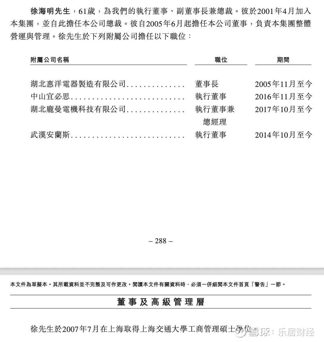 另外,徐海明,61岁,为公司执行董事、副董事长兼总裁。其1982年起在武汉铁路分局工作,1992年任职于广州先导技术工程有限公司担任总经理。于2001年4月加入集团,并自此担任公司总裁。其自2005年6月起担任公司董事,负责集团整体营运与管理。