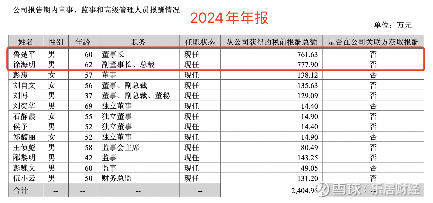 薪酬方面,2024年徐海明的年薪为777.9万元,而鲁楚平的年薪为761.63万元,彭惠的年薪为138.12万元。