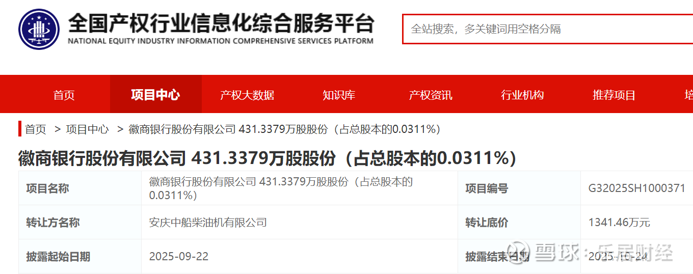 瑞财经 王敏9月23日,据全国产权交易中心,徽商银行股份有限公司 431.3379万股股份(占总股本的0.0311%)挂牌转让,转让底价为1341.46万元,转让方为安庆中船柴油机有限公司,披露结束日期为2025-10-24。