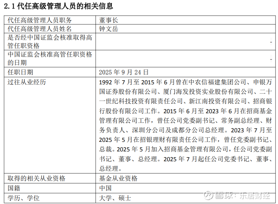 钟文岳,1992年7月至2015年6月曾在中农信福建集团公司、申银万国证券股份有限公司、厦门海发投资实业股份有限公司、二十一世纪科技投资有限责任公司、新江南投资有限公司、招商银行股份有限公司工作。2015年6月至2023年6月在招商基金管理有限公司工作,曾任公司党委副书记、常务副总经理、财务负责人、深圳分公司及成都分公司总经理。2023年7月至2025年5月在招银理财有限责任公司工作,曾任党委副书记、总裁。2025年5月加入招商基金管理有限公司,任公司党委副书记、董事、总经理。2025年7月起任公司党委书记、董事、总经理。