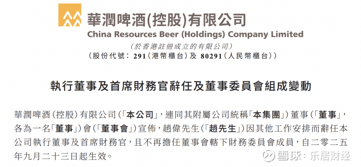 瑞财经 刘治颖9月23日,华润啤酒(00291)公告,赵伟因其他工作安排而辞任公司执行董事及首席财务官,且不再担任董事会辖下财务委员会成员,即日起生效。
