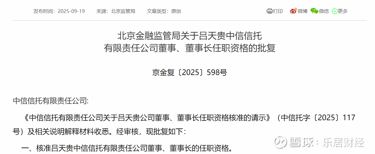瑞财经 王敏近日,国家金融监督管理总局北京金融监管局发布公告,批复同意中信信托有限公司董事长吕天贵的任职资格。