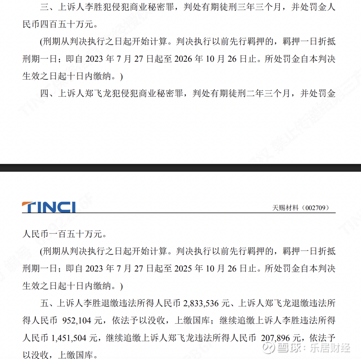 2025年2月,九江市濂溪区人民法院就天赐材料全资附属公司九江天赐的两名前员工涉嫌刑事侵犯商业秘密罪一案作出一审判决,认定二人罪名成立。两名被告人均对一审判决提起上诉。经上诉,九江市中级人民法院于2025年9月作出终审判决,维持有罪判决,但调整了量刑。该判决为终审判决,不得上诉。