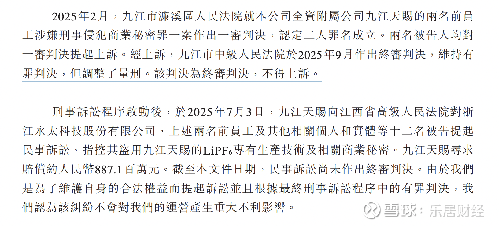 刑事诉讼程序启动后,于2025年7月3日,九江天赐向江西省高级人民法院对永太科技、上述两名前员工及其他相关个人和实体等十二名被告提起民事诉讼,指控其盗用九江天赐的LiPF6专有生产技术及相关商业秘密。九江天赐寻求赔偿约8.87亿元。截至本文件日期,民事诉讼尚未作出终审判决。