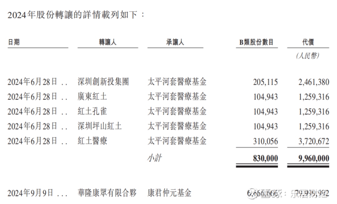 2024年6月,深圳创新投集团实体向太平河套医疗基金转让合共83万股股份,套现了996万元;华隆康众有限合伙向康君仲元基金转让666.67万股股份,套现8000万元。