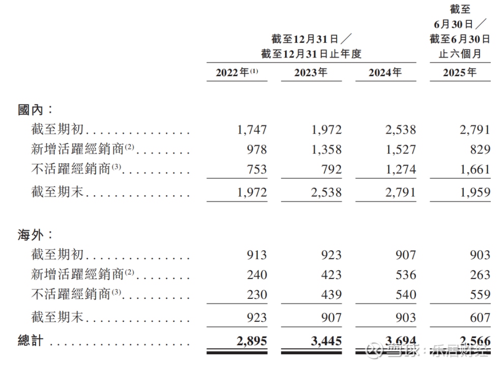 报告期各期末,公司国内经销商分别有1972个、2538个、2791个及1959个,海外经销商分别为923个、907个、903个及607个。2025年上半年,公司经销商数量较2024年锐减1128个。