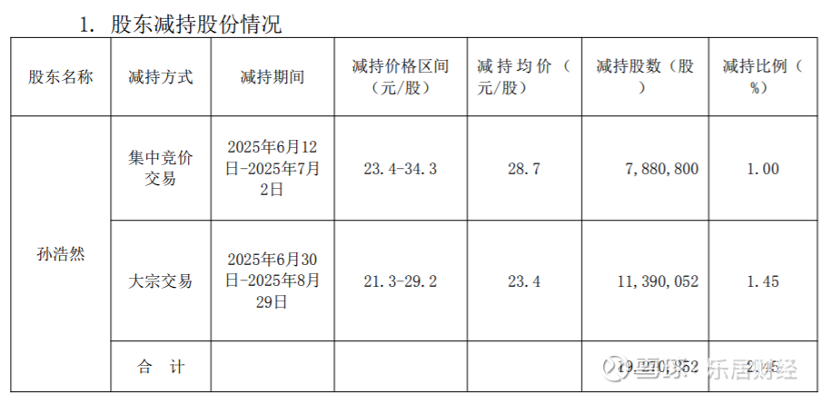 孙浩然在2025年6月30日到2025年8月29日通过大宗交易的方式减持11,390,052股(减持比例1.45%),减持均价为23.4元,减持比例为1.45个百分点的拉卡拉股权,套现2.66亿元。