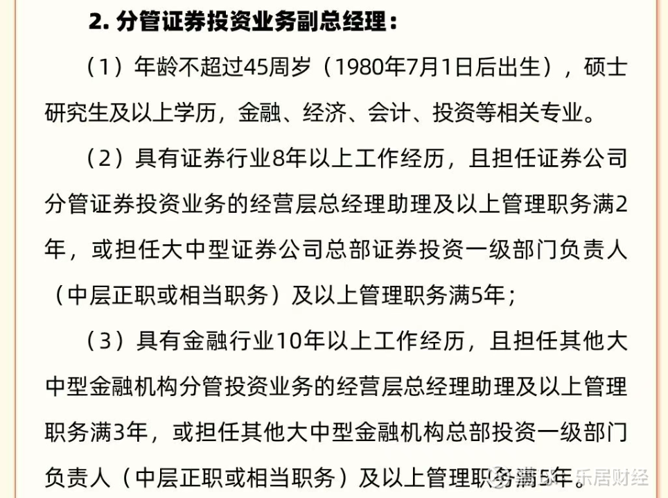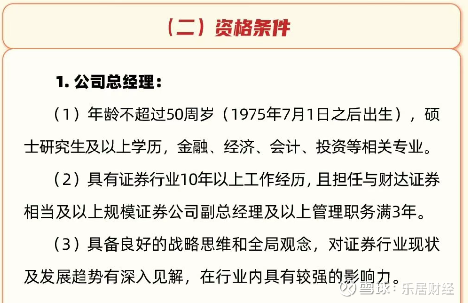 从资格条件来看,总经理一岗位要求候选人年龄不超过50周岁(1975年7月1日之后出生),硕士研究生及以上学历,金融、经济、会计、投资等相关专业;且具有证券行业10年以上工作经历,且担任与财达证券相当及以上规模证券公司副总经理及以上管理职务满3年。