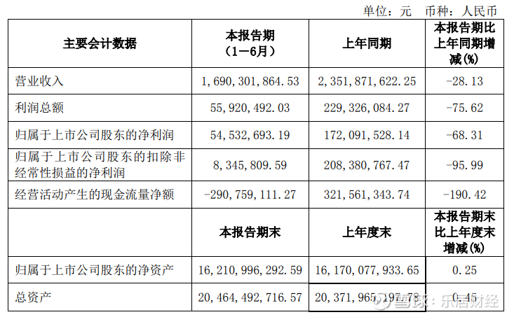 报告显示,方大炭素公司上半年营业收入为16.90亿元,同比下降28.13%;归母净利润为5453.27万元,同比下降68.31%;扣非归母净利润为834.58万元,同比下降95.99%;基本每股收益0.01元。