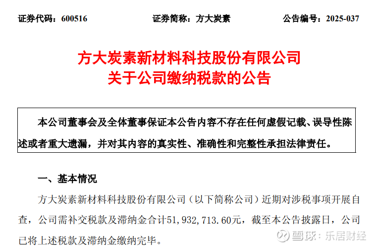 9月3日晚间,方大炭素发布关于缴纳税款的公告,公司近期对涉税事项开展自查,需补交税款及滞纳金合计5193.27万元,截至公告披露日,公司已将上述税款及滞纳金缴纳完毕。方大炭素表示,上述缴纳的税款及滞纳金已计入公司2025年当期损益,预计将减少公司2025年度归属于上市公司股东的净利润5193.27万元,最终以2025年度经审计的财务报表为准。