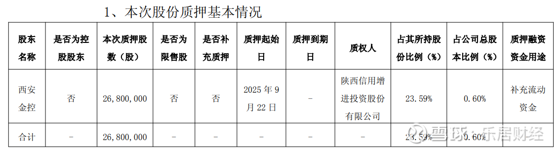 此次质押股份占西安金控持有该行股份的23.59%,占西安银行股份总数的0.60%。