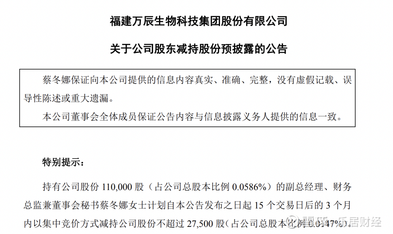 瑞财经 刘治颖9月24日,万辰集团(SZ300972)公告,公司近日收到副总经理、财务总监兼董事会秘书蔡冬娜出具的《股份减持计划告知函》。