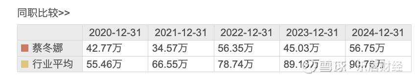 东方财富数据显示,2020年至2024年,蔡冬娜薪酬分别为42.77万元、34.57万元、56.35万元、45.03万元、56.75万元。